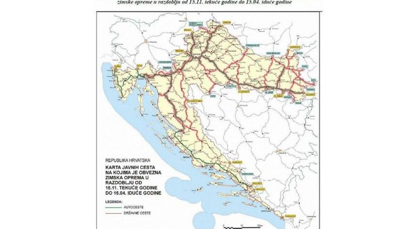 Uređeno je to Odlukom Ministarstva pomorstva, prometa i infrastrukture o obaveznoj zimskoj opremi (Narodne novine 145/2013, od 6.12.2013.). U zimske dionice javnih cesta ulazi 839,2 km autocesta i 1523,3 km državnih i županijskih cesta te 68,1 km državnih cesta za tranzitni promet iz trajektnih luka Vukovar, Osijek, odnosno luke i rafinerije Sisak.
