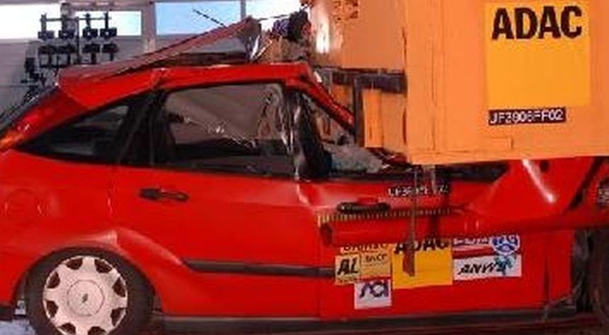 Test 2: Nalet putničkog vozila brzinom od 56 km/h u parkiranu prikolicu teretnog vozila sa optimiziranom zaštitom od zadnjeg podlijetanja (redizajnirana konstrukcija koja pruža poboljšane karakteristike).